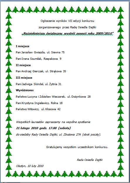 zakończenia konkursu na najładniejsza dekorację świąteczną posesji