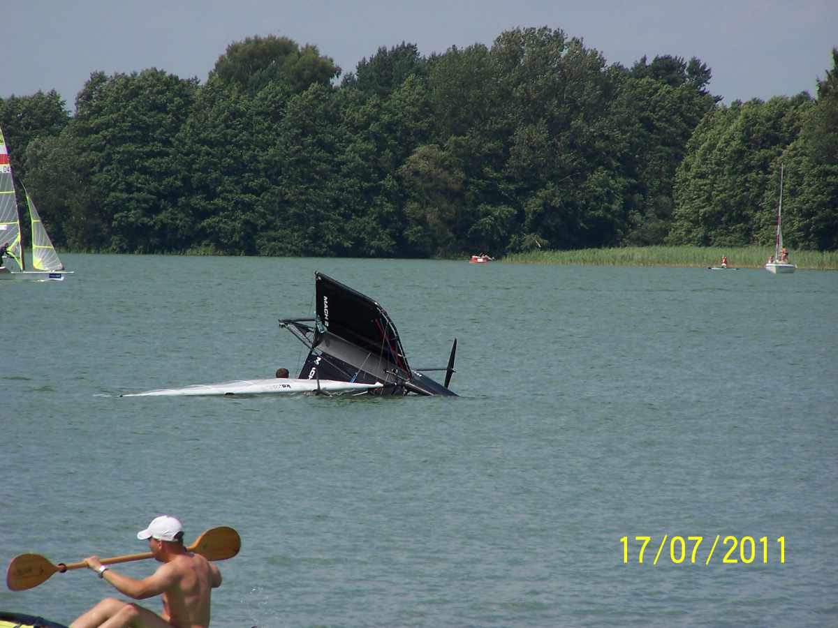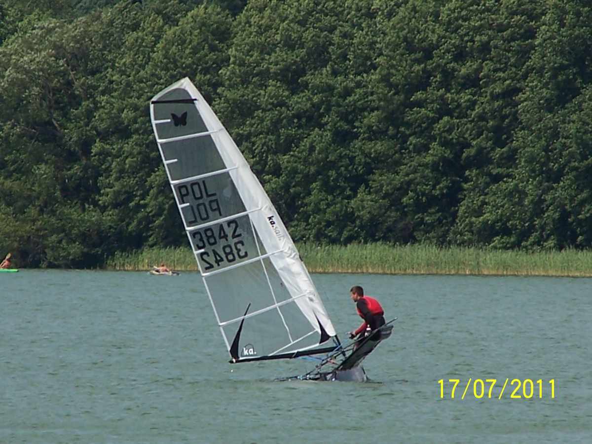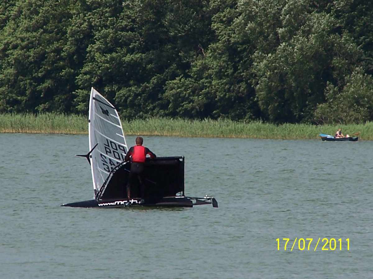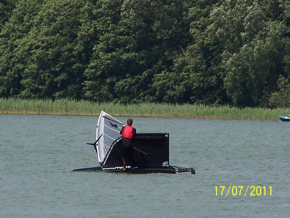 | Na Jeziorze Ukiel w czasie regat Pucharu Świata w olimpijskiej klasie 49er - VOLVO OLYMPIC CUP pojawił się dziwny jacht, bo nie był to jednak żaden pomnik, a tym bardziej fantom! Od czasu do czasu poruszał się z dość dużą szybkością napędzany oczywiście wiatrem! A że żeglowanie tym dziwactwem nie było łatwe, to się można było przekonać co chwilę. Poniższe zdjęcia to obrazują. Prowadzący zawody spiker poinformował, że jest to jedyny egzemplarz w Polsce , jak widać trudny do okiełznania. Ponoć waży tylko ok. 20 kilogramów i jest dość drogi, ale robił duże wrażenie na widzach! | ||