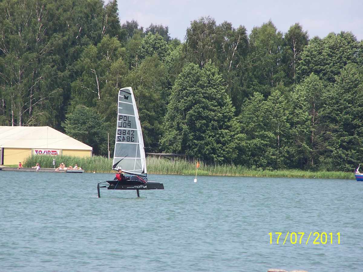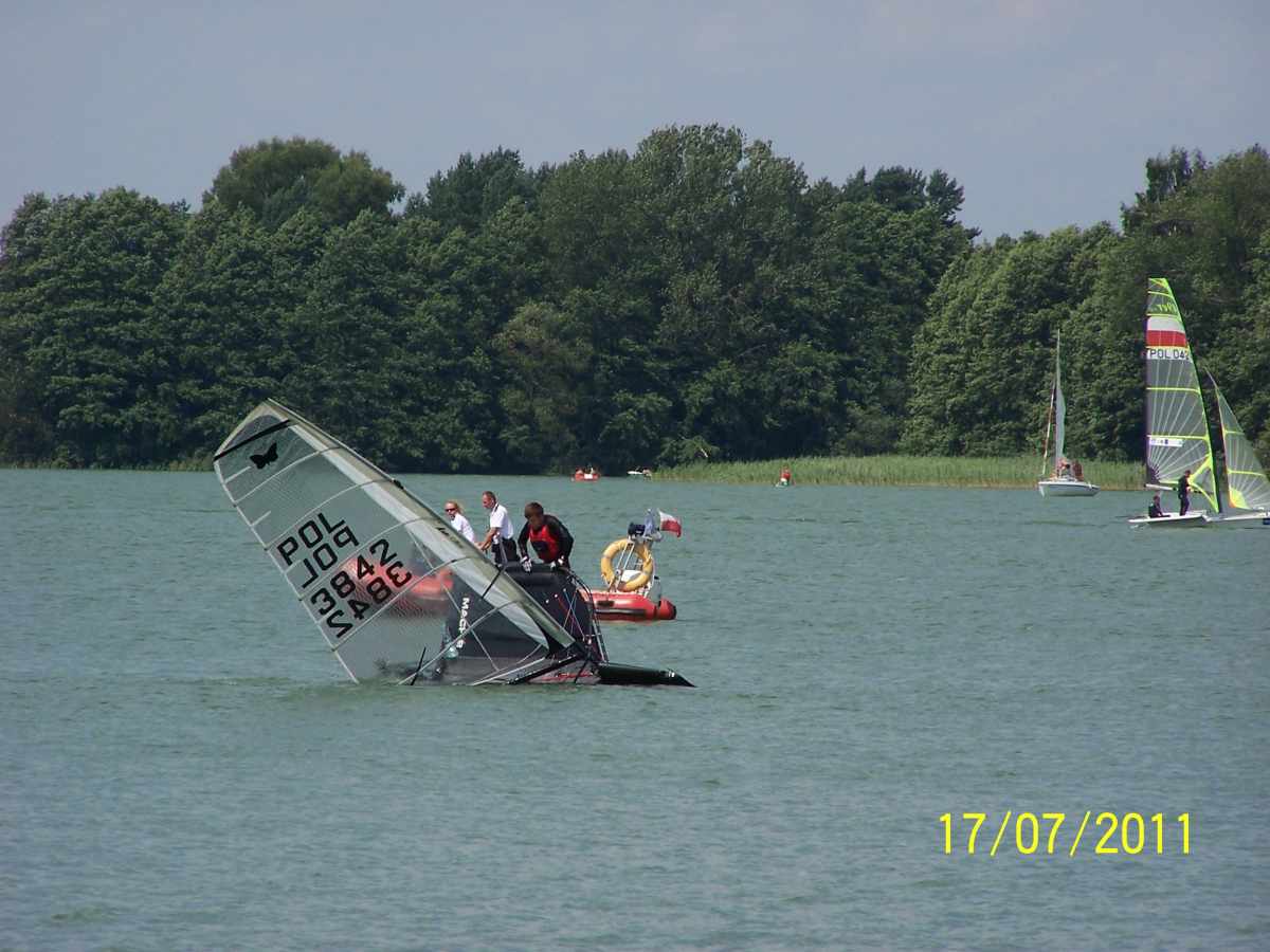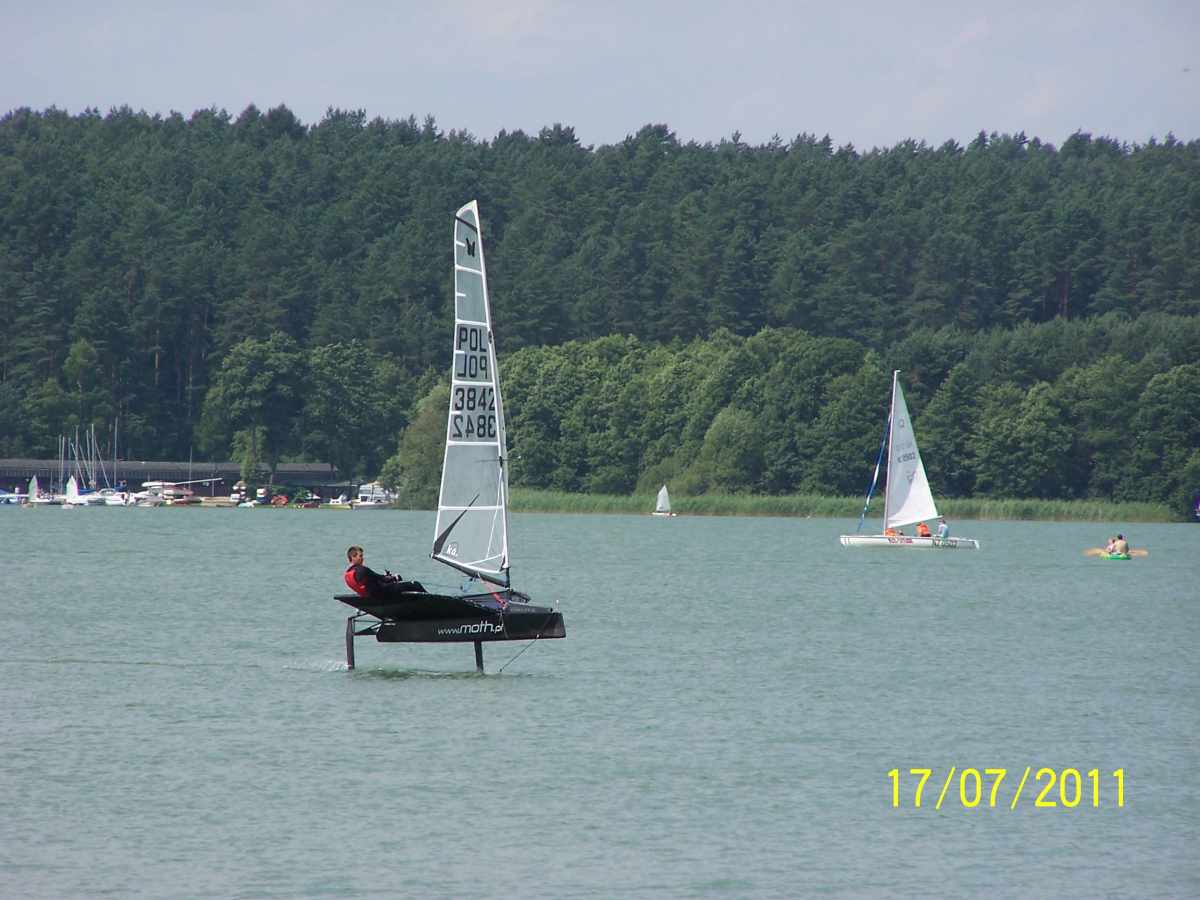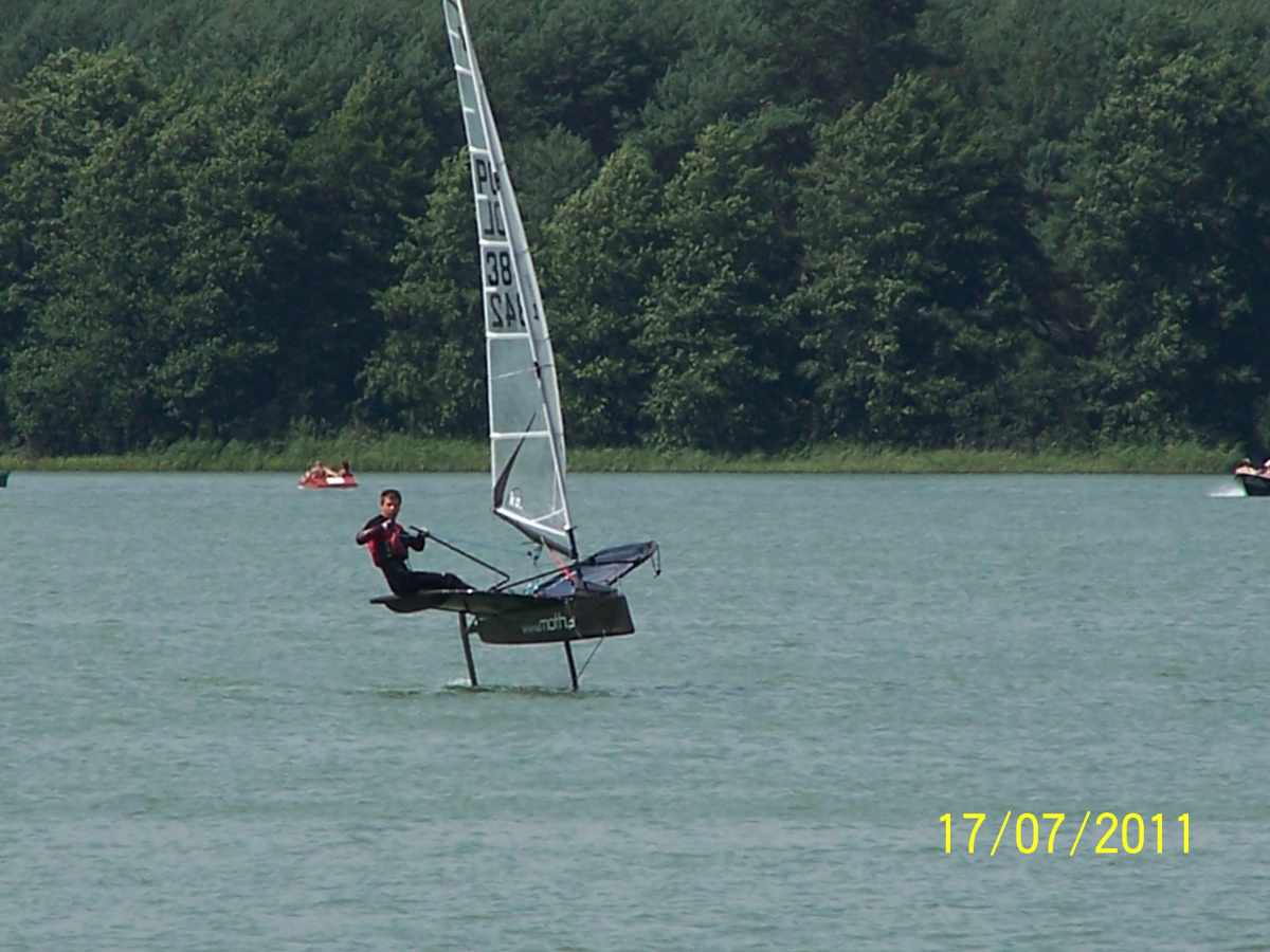 | Na Jeziorze Ukiel w czasie regat Pucharu Świata w olimpijskiej klasie 49er - VOLVO OLYMPIC CUP pojawił się dziwny jacht, bo nie był to jednak żaden pomnik, a tym bardziej fantom! Od czasu do czasu poruszał się z dość dużą szybkością napędzany oczywiście wiatrem! A że żeglowanie tym dziwactwem nie było łatwe, to się można było przekonać co chwilę. Poniższe zdjęcia to obrazują. Prowadzący zawody spiker poinformował, że jest to jedyny egzemplarz w Polsce , jak widać trudny do okiełznania. Ponoć waży tylko ok. 20 kilogramów i jest dość drogi, ale robił duże wrażenie na widzach! | ||