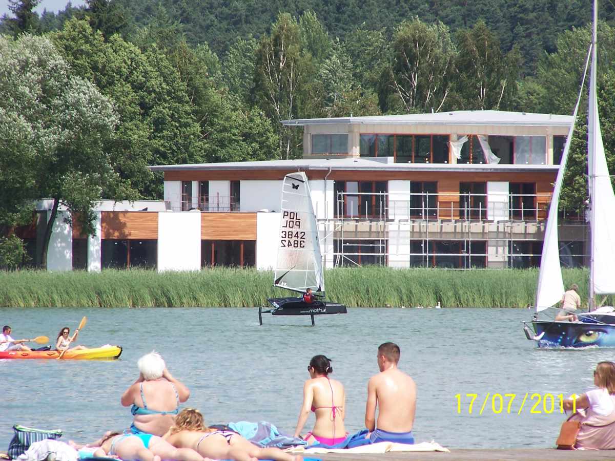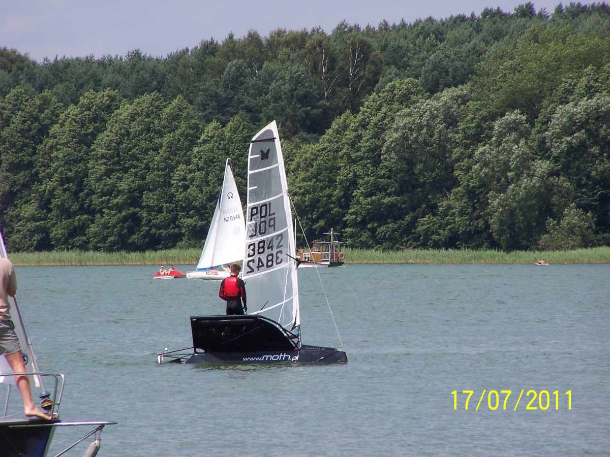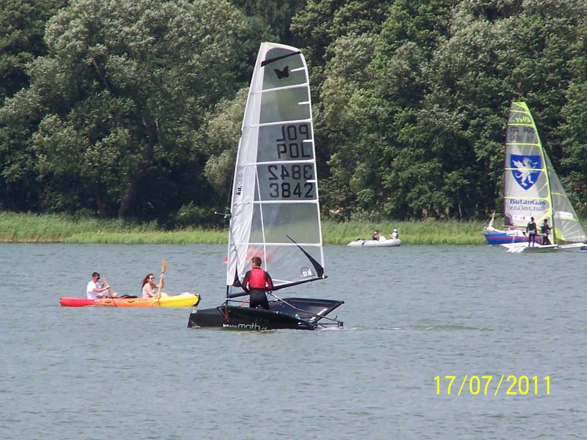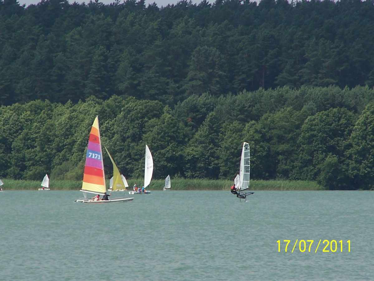 | Na Jeziorze Ukiel w czasie regat Pucharu Świata w olimpijskiej klasie 49er - VOLVO OLYMPIC CUP pojawił się dziwny jacht, bo nie był to jednak żaden pomnik, a tym bardziej fantom! Od czasu do czasu poruszał się z dość dużą szybkością napędzany oczywiście wiatrem! A że żeglowanie tym dziwactwem nie było łatwe, to się można było przekonać co chwilę. Poniższe zdjęcia to obrazują. Prowadzący zawody spiker poinformował, że jest to jedyny egzemplarz w Polsce , jak widać trudny do okiełznania. Ponoć waży tylko ok. 20 kilogramów i jest dość drogi, ale robił duże wrażenie na widzach! | ||