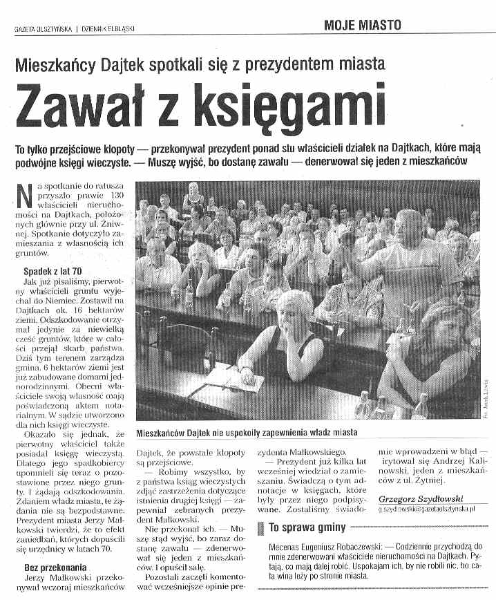 Sprawa bałaganu i karygodnej niefrasobliwości władz Olsztyna w sprawie sprzedaży, co najmniej 16 hektarów cudzej ziemi pod budowę części osiedla Dajtki była wczoraj przedmiotem zebrania w Ratuszu ponad 150 mieszkańców Dajtek. Spotkanie to zorganizował Prezydent Cz. Małkowski, który chciał wytłumaczyć zaniepokojonym właścicielom działek, że nie mają się czego obawiać, że ich własność nie może być naruszona. Jednak po wysłuchaniu wyjaśnień, co do przebiegu walki byłych, a może i jeszcze dzisiejszych właścicieli wspomnianych 16 hektarów, można było dojść do przekonania, że nikt nie panuje nad sytuacją. Prezydent mógł w tej sytuacji tylko słownie zapewniać, że nikomu się krzywda nie stanie i jako jedyny dowód na to zacytował fragment pisma, jakie skierował spadkobierca po właścicielu szesnasto hektarowego gospodarstwa rolnego do władz miasta. W piśmie tym o żądanie odszkodowania wnioskodawca zapewniał, że nie jest jego intencją odbieranie ziemi a tylko otrzymanie odszkodowania. To zdanie, napisane na cierpliwym papierze ma świadczyć o tym, że obecni właściciele iluzorycznych KSIĄG WIECZYSTYCH mogą spać spokojnie!!! Jednocześnie Prezydent zaznaczył, że tak naprawdę to nikt nie wie, co z tym całym bałaganem zrobi sąd, do którego w ostatecznym rozrachunku należy decyzja! Przedstawiciela sądu, mimo zaproszenia na spotkanie nie było, a Prezes Sądu Olsztyńskiego jest na urlopie. Mimo, że wyszło na jaw, że całe pokolenia naszych urzędników ratuszowych (już od 30 lat) łamały prawo, według słów obecnych rządzących naszym miastem, wszystko jest w porządku i można temu zaufać! I jak zwykle w kontakcie z urzędnikami usłyszałem na moje uwagi wygłoszone dość głośno po udzieleniu mi głosu, że krzyczę, co jest nie na miejscu!!! Och, ile razy to już słyszałem, że na urzędnika nie można krzyczeć! On jest przede wszystkim bardzo wrażliwy i zawsze postępuje według prawa, zawsze działa na korzyść OBYWATELA! Czy PANSTWO nie jesteście zadowoleni, że macie własność wieczystą przekształconą na własność rzeczywistą? Spytał jeden z URZĘDNIKÓW z prezydium zgromadzenia ! O tak, na pewno!!! -ktoś odpowiedział z sali.... |