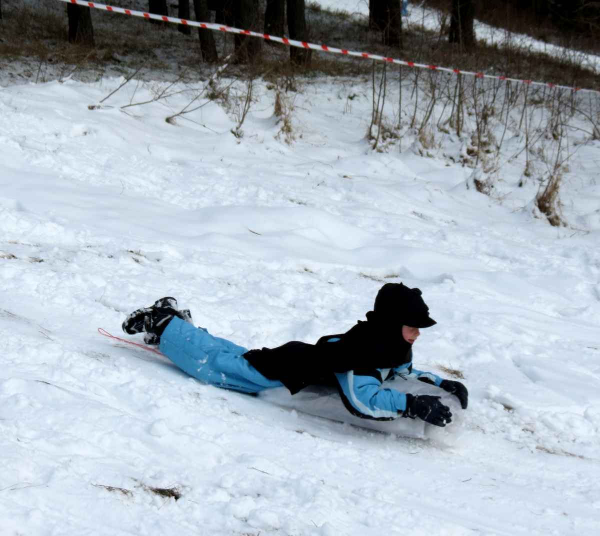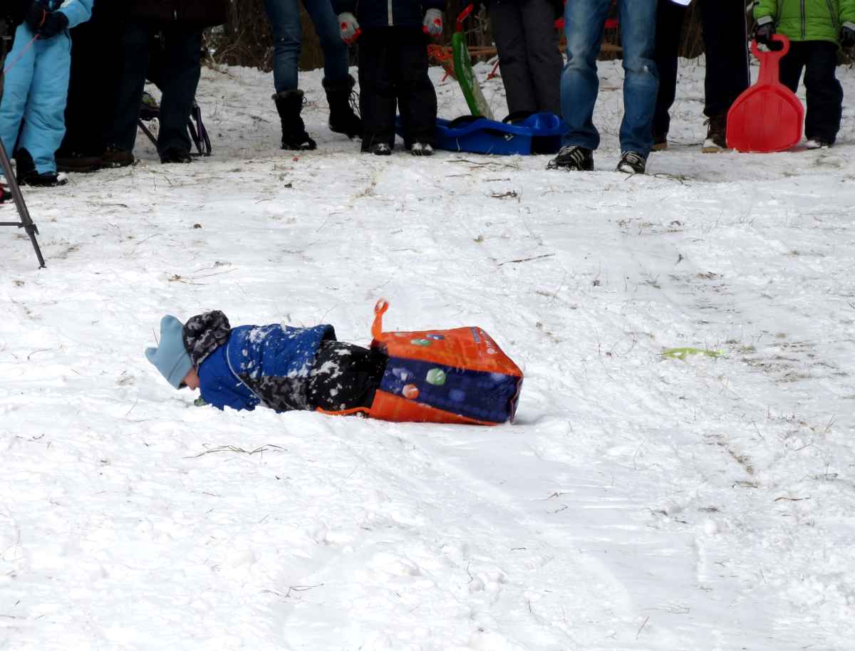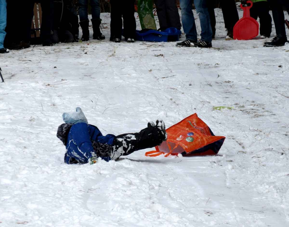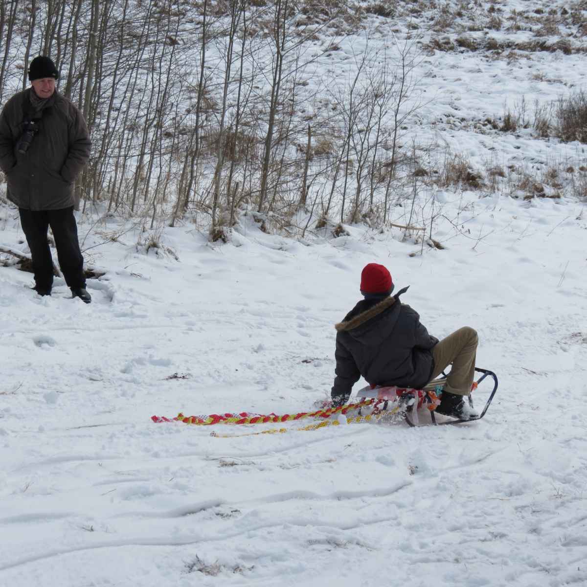 | Tu już zupełnie się nie dało konkurować w zjeżdżaniu! Torba na zakupy to niestety nie sanki, mimo odwagi jaką się wykazał maluch ! | ||